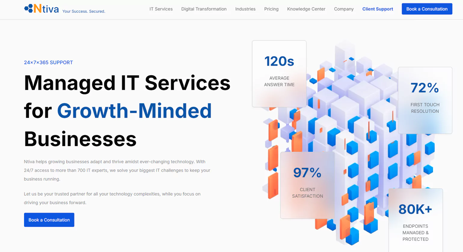 Virginia-based Ntiva is well-regarded for Microsoft and Apple device management along with managed IT support. With SOC 2 certification and a customer-centric CORE approach, Ntiva boasts a 5-star rating on Clutch for responsiveness and fair pricing. Their comprehensive services cover strategic consulting, cloud, cybersecurity, and application support, making them an excellent choice for enterprises needing specialized technical support.
